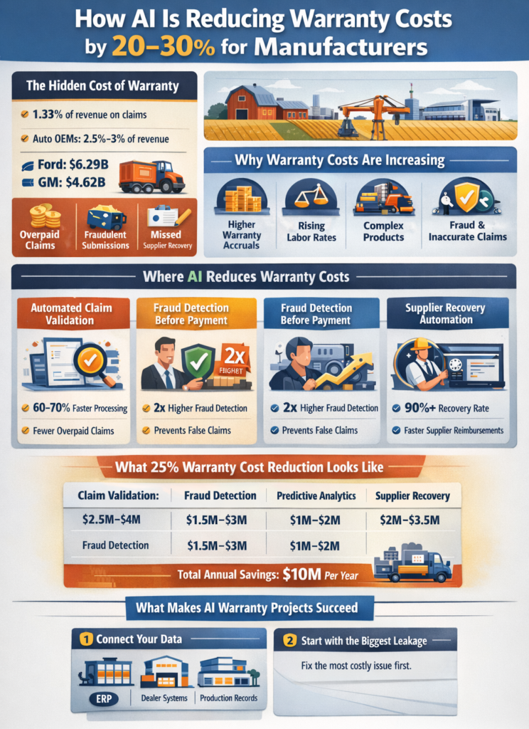 Manufacturers deploying AI across claim validation, fraud detection, predictive analytics, and supplier recovery report total warranty cost reductions of 20% to 30% within 12 to 18 months of implementation. The largest savings come from automated policy enforcement (which eliminates over-approvals) and supplier recovery automation (which recovers costs that were previously absorbed). A 2026 industry analysis found operational cost reductions of 30% to 50% among manufacturers with mature AI warranty systems.